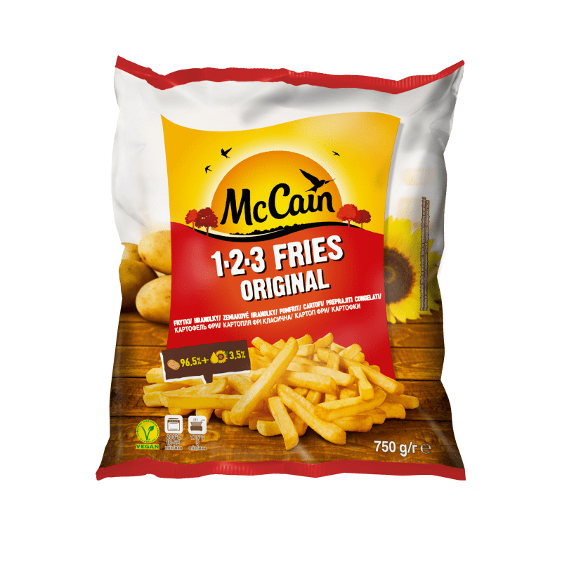 1 · 2 · 3 Fries sú našou klasikou určenou na prípravu pečením v rúre. Obľúbené pre jedinečnú chuť a chrumkavosť. Ak ich pripravíte pečením v rúre, obsahujú len 3,5 % tuku. Dostupné v 750 g a 1500 g baleniach. Výrobok s certifikátom VEGAN.